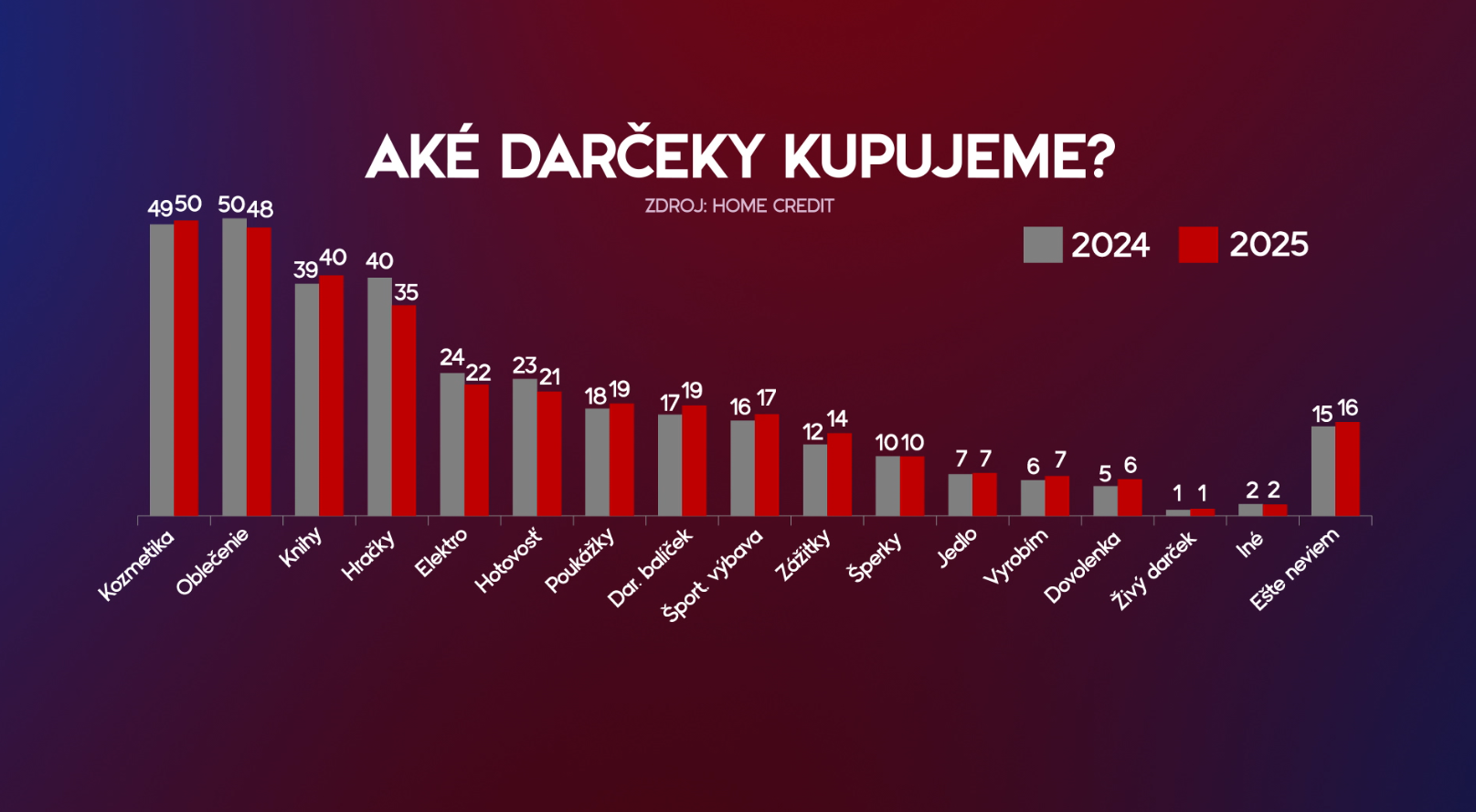Medzi najčastejšie darčeky patria kozmetika, oblečenie, knihy, hračky a elektronika. Ondrušek upozorňuje, že knihy predbehli hračky, čo môže signalizovať návrat k praktickejším darčekom. Hotovosť ako darček je typická pre ľudí nad 50 rokov, zatiaľ čo zážitky preferujú ľudia z väčších miest s vysokoškolským vzdelaním.