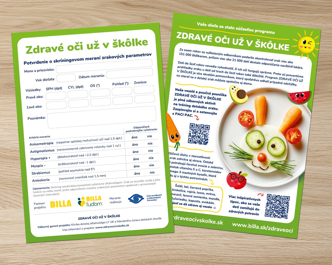 Tupozrakosť, škúlenie, astigmatizmus či ďalekozrakosť – aj to sú očné odchýlky, ktoré dokážu u detí od troch do šiestich rokov odhaliť vyškolení odborníci z programu Zdravé oči už v škôlke. Za týmto preventívnym projektom stoja Únia nevidiacich a slabozrakých Slovenska (ÚNSS), spoločnosť BILLA a jej o. z. BILLA ľuďom. Diagnostika zraku je u detí v predškolskom veku mimoriadne podstatná a odôvodnená, pretože ochorenie oka je ešte možné vyliečiť a zvrátiť.