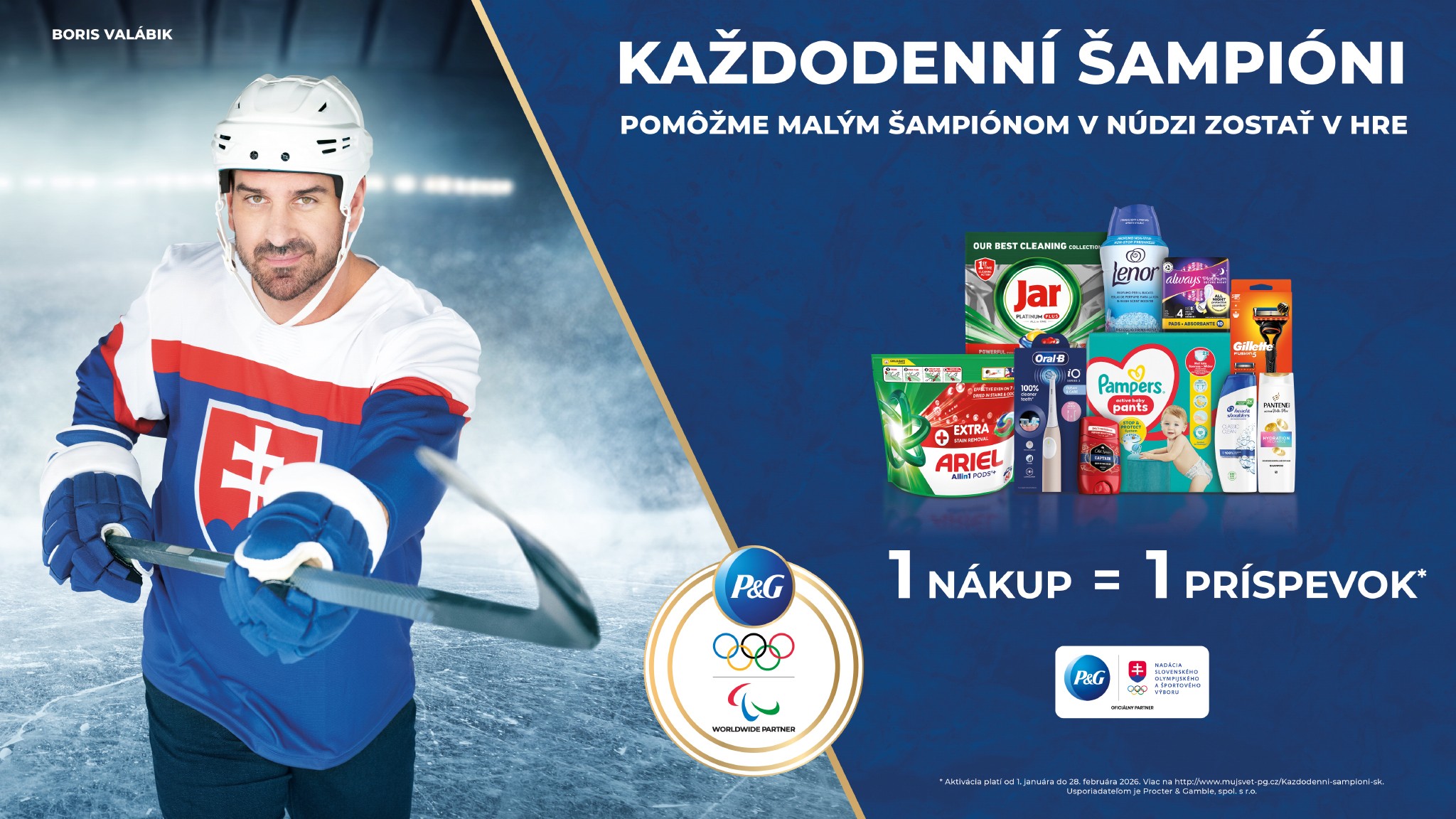 Spoločnosť Procter & Gamble tento rok odštartovala s jednou zo svojich najväčších charitatívnych kampaní na Slovensku. Kampaň Každodenní šampióni prebiehala od 1. januára do 28. februára 2026. Ambasádorom a hlasom bol významný slovenský hokejista a jeden z našich najúspešnejších športovcov, bývalý hráč NHL a hokejový obranca Boris Valábik.