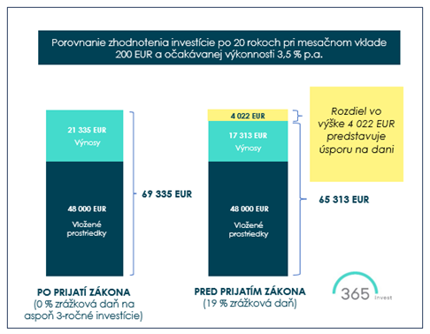 "Nová legislatíva ešte viac zatraktívni investovanie pre ľudí. V čase rastúcej inflácie to vnímame, ako správny krok motivovať ich k investovaniu. Uvedené zmeny v praxi znamenajú, že klient ušetrí na dani, ktorú po novom po troch rokoch už nebude musieť platiť vôbec. To znamená, že dosiahne vyšší investičný výnos. Na modelovom príklade pravidelného sporenia sumy 200 EUR mesačne po dobu 20 rokov s očakávaným výnosom napríklad na úrovni 3,5 % ročne, by tak človek usporil na dani vyše 4 000 EUR. V konečnom výsledku by tak našetril viac ako 21 000 EUR." hovorí Tomáš Cár, Real Estate Transactions, 365.invest.