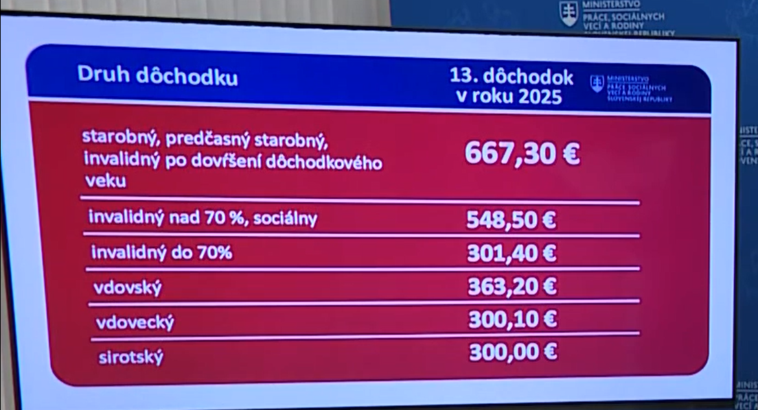 BRATISLAVA / Sociálna poisťovňa od 2. decembra začala s vyplácaním trinásteho dôchodku, ktorý by mal byť pre všetkých poberateľov doručený najneskôr do 19. decembra. Štát vyplatí na tieto účely viac ako 917 miliónov eur. Na tlačovej konferencii o tom informoval minister práce Erik Tomáš (Hlas-SD).