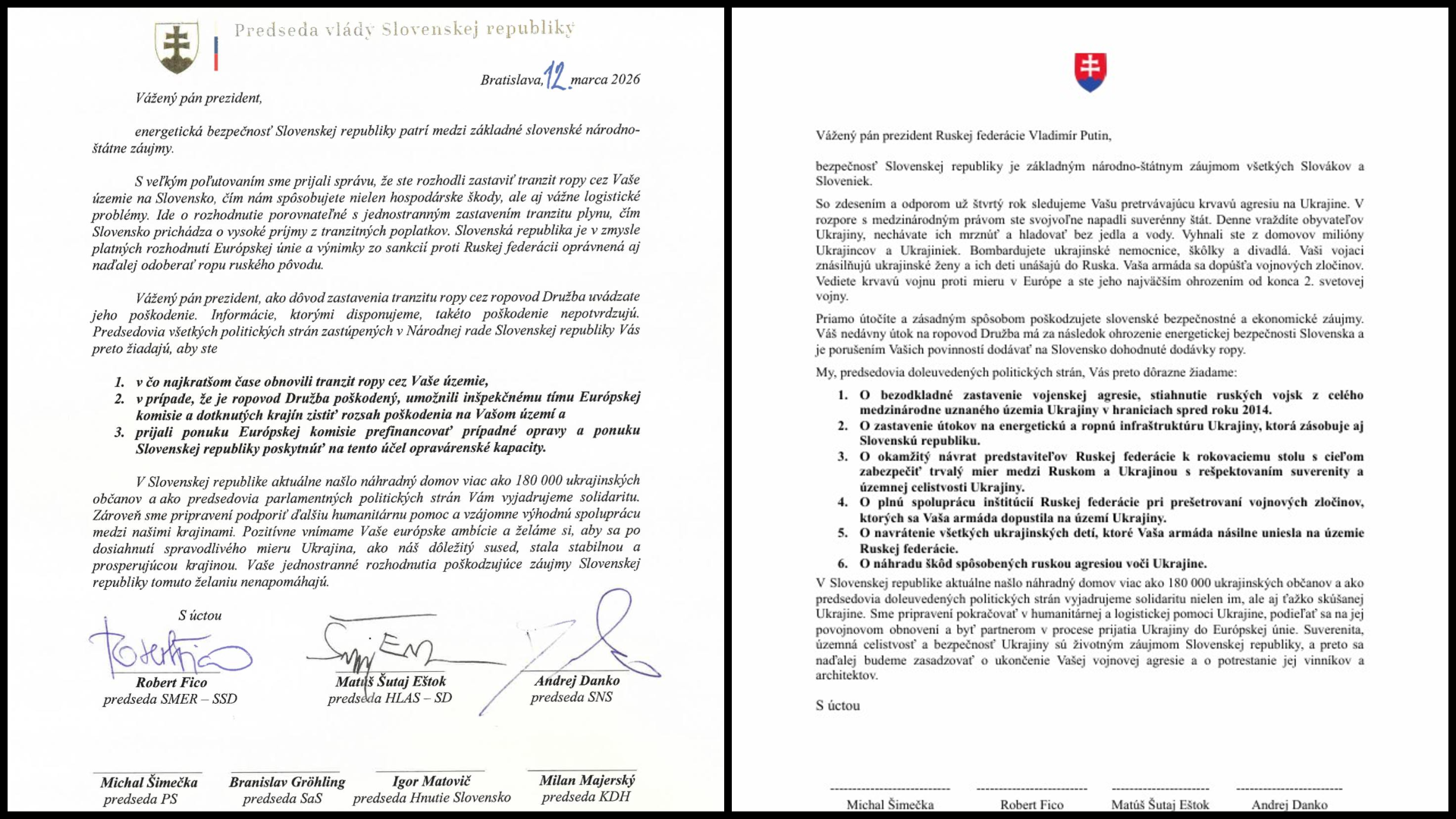 "V Slovenskej republike aktuálne našlo náhradný domov viac ako 180 000 ukrajinských občanov a ako predsedovia doleuvedených politických strán vyjadrujeme solidaritu nielen im, ale aj ťažko skúšanej Ukrajine. Sme pripravení pokračovať v humanitárnej a logistickej pomoci Ukrajine, podieľať sa na jej povojnovom obnovení a byť partnerom v procese prijatia Ukrajiny do Európskej únie. Suverenita, územná celistvosť a bezpečnosť Ukrajiny sú životným záujmom Slovenskej republiky, a preto sa naďalej budeme zasadzovať o ukončenie Vašej vojnovej agresie a o potrestanie jej vinníkov a architektov," uvádza sa na záver. Podpisy v liste žiadajú od predsedov koaličných aj opozičných strán a taktiež od predsedu hnutia Slovensko Igora Matoviča a predsedu Demokratov Jaroslava Naďa.