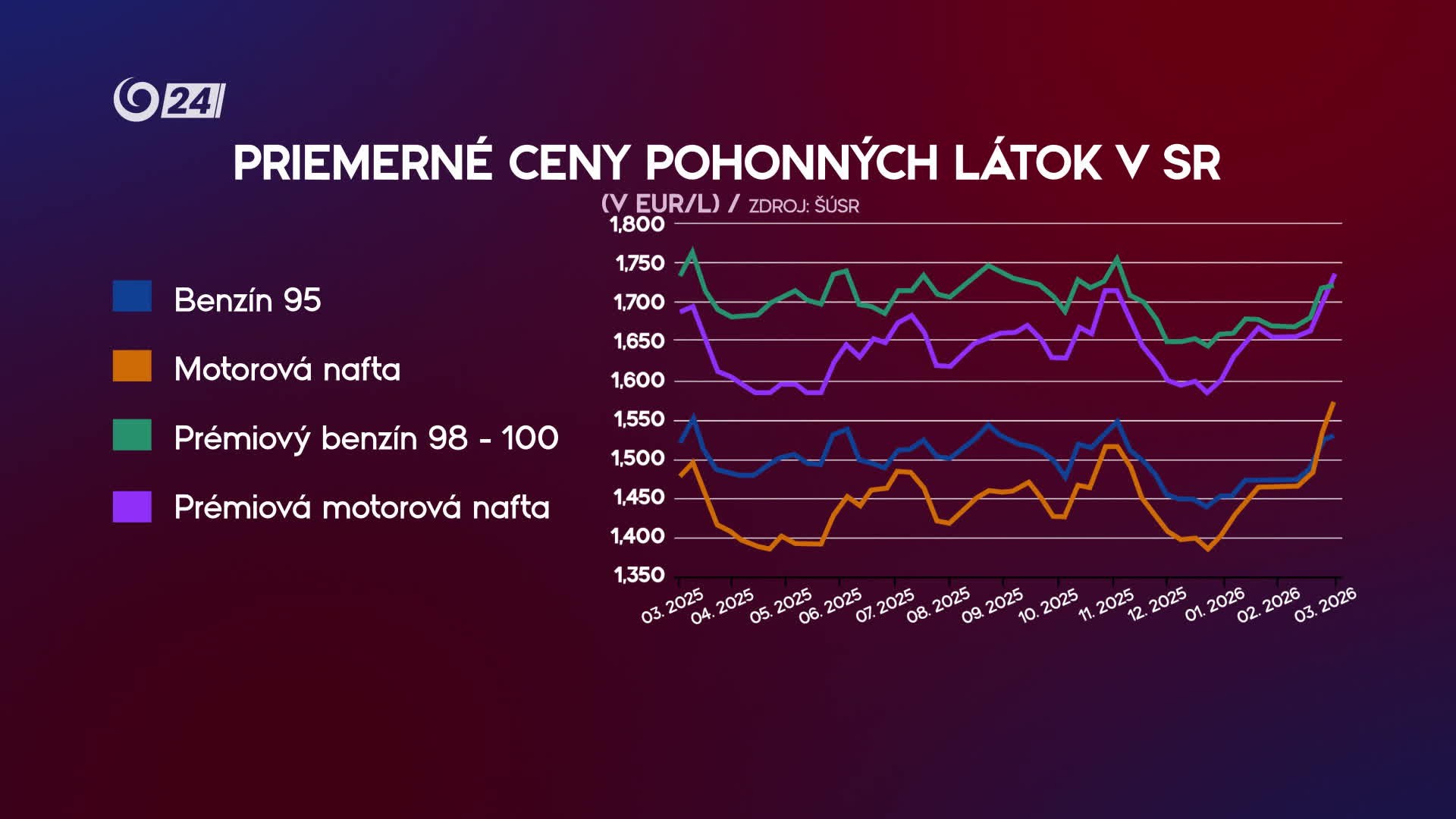 Ceny palív v posledných dňoch rástli, pričom výraznejšie zdražovala nafta. Tá sa podľa Greguša pohybuje približne medzi 1,6 až 1,7 eura za liter, zatiaľ čo benzín stojí okolo 1,55 až 1,6 eura.