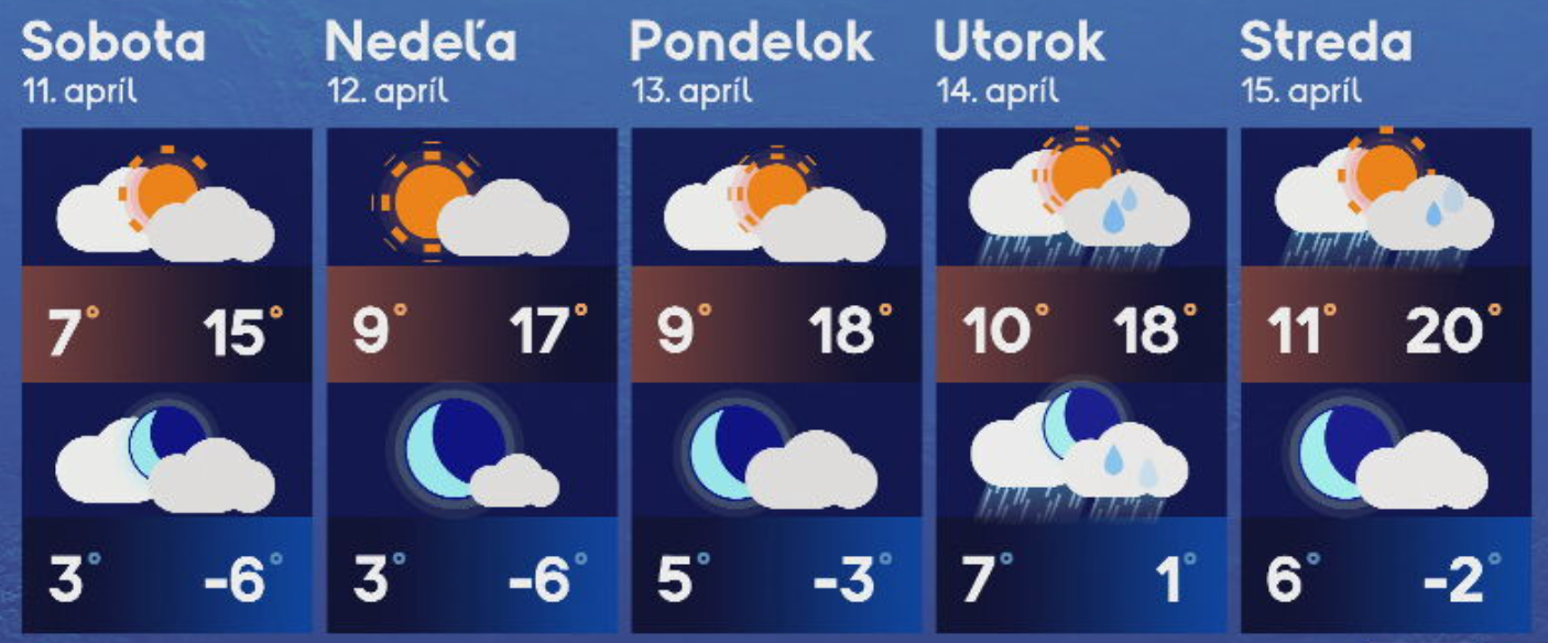Aj nasledujúce dni prinesú premenlivé počasie s prevažne jasnou až polooblačnou oblohou. Slnečných lúčov by malo byť viac a zrážky sa objavia len zriedka. Teploty budú postupne stúpať. Už v pondelok (13. apríla) by sa mali vyšplhať na príjemných 10 až 18 stupňov.