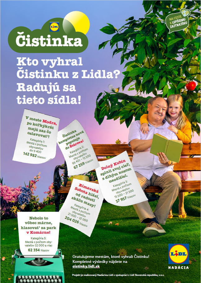 INZERCIA / Víťazi prvého ročníka hlasovania o mestské parky jedna báseň – Lidl Čistinky sú známi. Sú nimi Modra, Štúrovo, Dolný Kubín, Rimavská Sobota a Komárno. Rozhodli o tom v internetovom hlasovaní zákazníci Lidl Slovenská republika, ktorí do súťaže poslali takmer 1 300 000 hlasov! Čistinky privítajú svojich prvých návštevníkov v lete 2023.