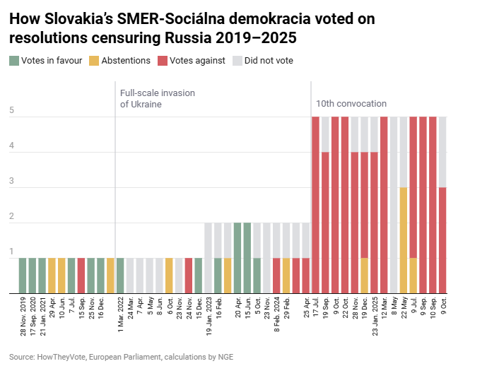 EUobserver a Novaya Gazeta Europe zverejnili aktualizované poradie najviac prokremeľských strán a poslancov Európskeho parlamentu. Strana SMER-SD, na čele s premiérom Robertom Ficom, rozšírila svoju delegáciu z dvoch na piatich poslancov. Teraz odmieta takmer každé uznesenie týkajúce sa Ruska – doteraz 12 zo 14. Môže ísť o snahu o "vyvážený" vzťah s Moskvou.
