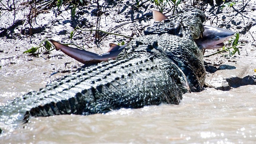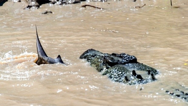 Vo vode sa objavila žraločia plutva. Pred ich zrakom sa odohral súboj, ktorý by nezahanbil ani filmy Čeľuste či Aligátor. Boj sa skončil vo chvíli, keď sa krokodílovi podarilo so žralokom v čeľustiach vyliezť na breh.